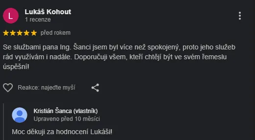 Vřele doporučuji pana Šancu na základě vlastní zkušenosti, která pro mne byla přínosem. Rychlé a spolehlivé jednání, hlavně korektní. Děkuji a doporučuji.